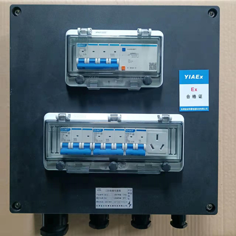 三防配電箱正泰元件,總開關(guān)帶漏電保護(hù),三個(gè)分開關(guān)帶一個(gè)導(dǎo)軌式插座,壁掛式安裝,三防箱采用工程塑料壓鑄而成,表面為黑色,下進(jìn)下出,外殼尺寸為360*360*120,可在戶內(nèi)戶外使用,優(yōu)質(zhì)緊固件,可根據(jù)客戶要求定制斷路器電流大小和級數(shù)。
